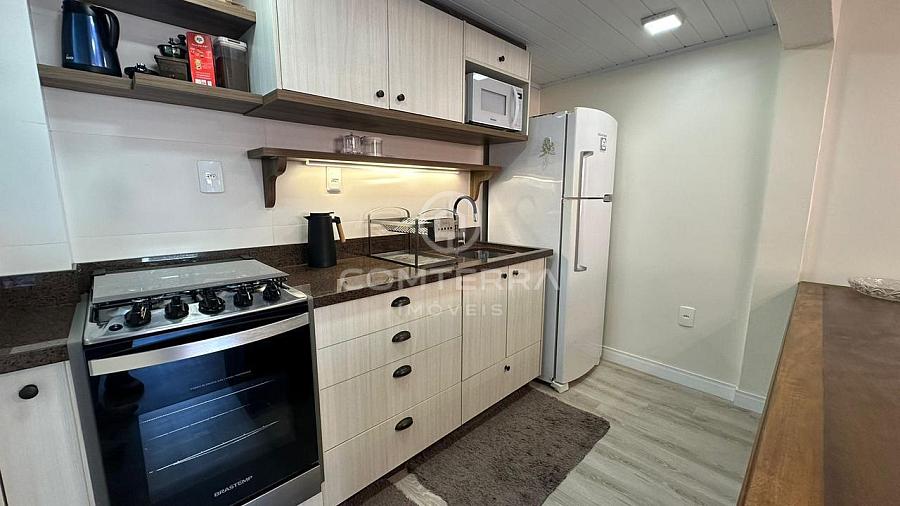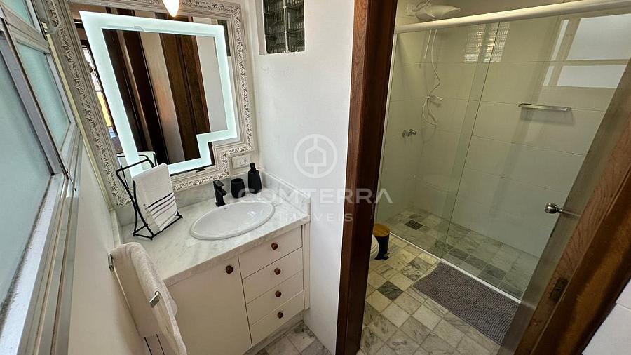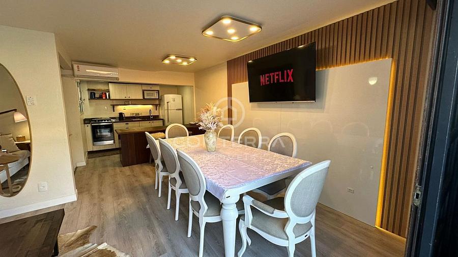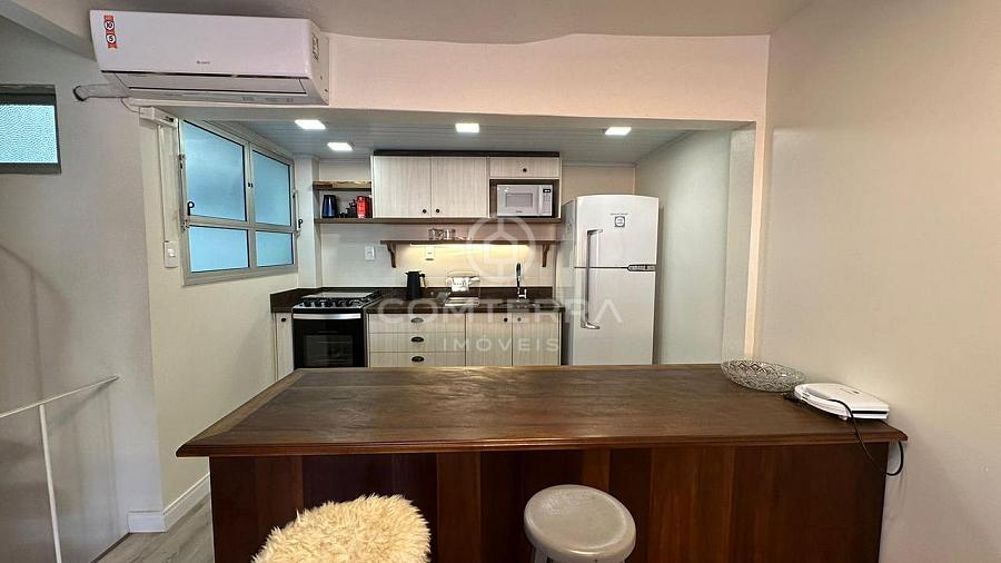 02 quartos, banheiro social, lavabo, cozinha/sala integrados, garagem, área de serviço, mesanino, mobiliado, climatizado.